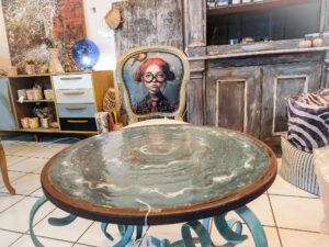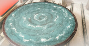 table ronde 65 cm de diamètre, 2 cm d’épaisseur en lave du Mont Dore. Emaillée au pinceau et à la poire.